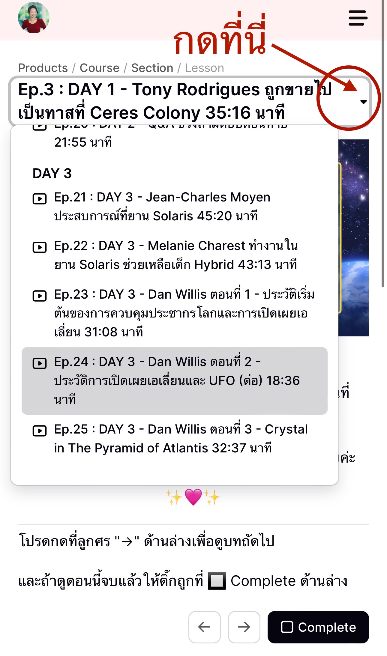 กดที่ลูกศรเล็กๆถัดจากชื่อ Ep. จะเห็นรายการ Ep. ทั้งหมด แล้วคุณเลือกดูคลิปวิดีโอจากทางนี้ได้สะดวกและง่ายที่สุดค่ะ
