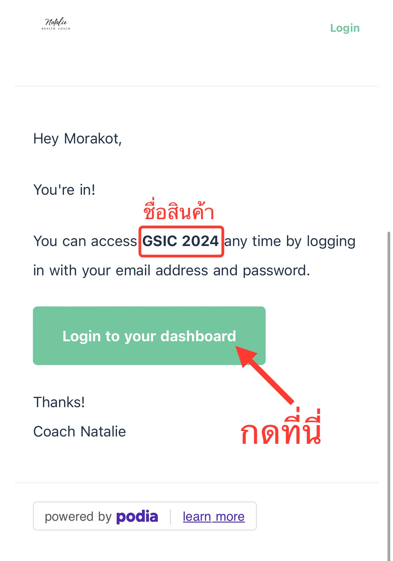 1) หลังจากที่คุณซื้อคอร์สหรือไฟล์ดาวน์โหลด คุณจะได้รับอีเมล ดังตัวอย่างในภาพนี้